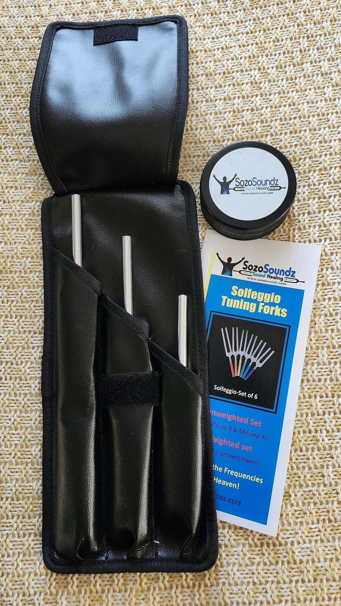 SozoSoundz offers the additional missing set of 3 Solfeggio tuning forks. Extra length on stem to allow for ease with body work.